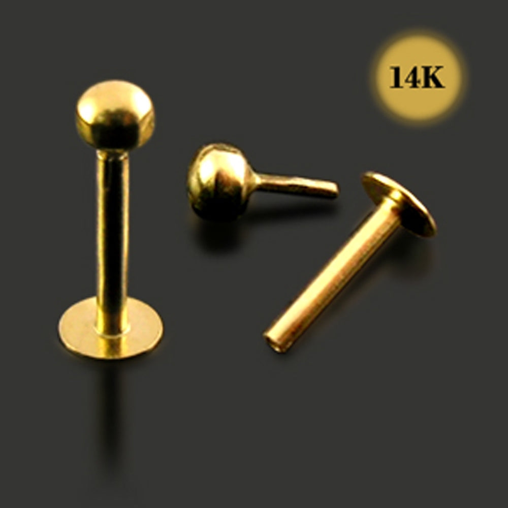 Step out as an ultimate diva as you slip on the 14K Gold Internal Lip Labret with 3mm Ball Top. Composed of 14K hollow yellow gold, this lip labret is available in a standard thickness: 16G=1.2 mm x 8 mm.