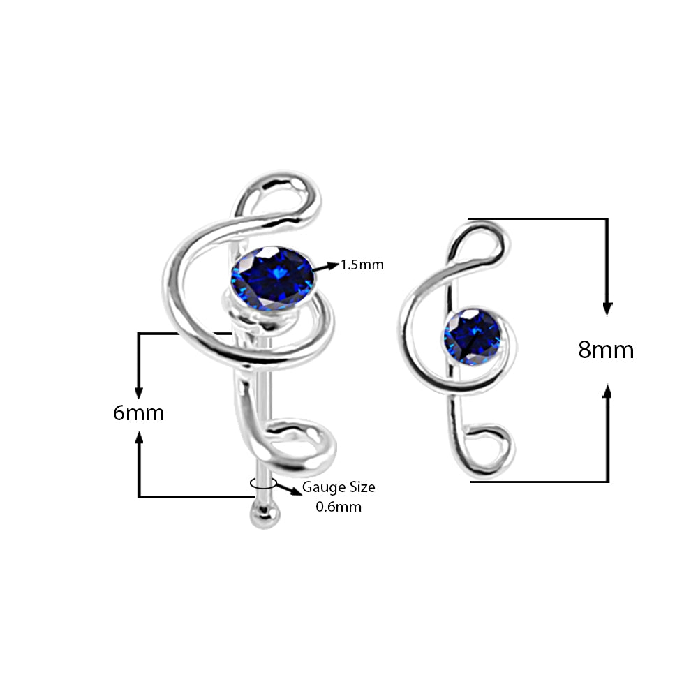 925 Sterling Silver Jeweled Clef Music Note Nose Bone Stud in Box